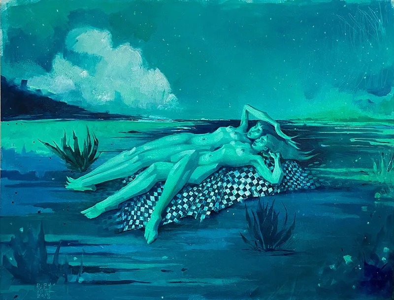 View fullsize  Wahine, Resting (Blue) | 28 × 24 inches | Acrylic on Panel | $3200 Framed